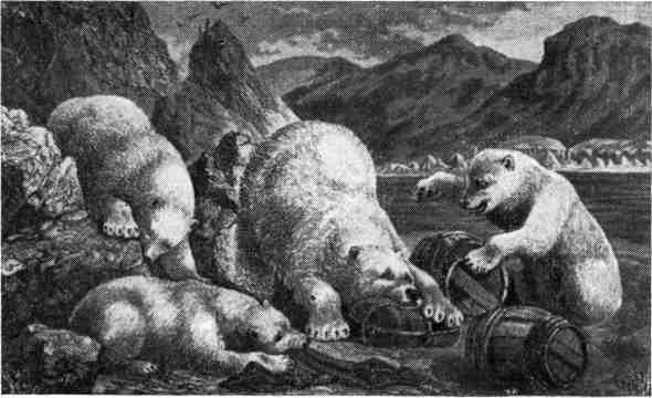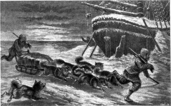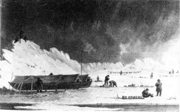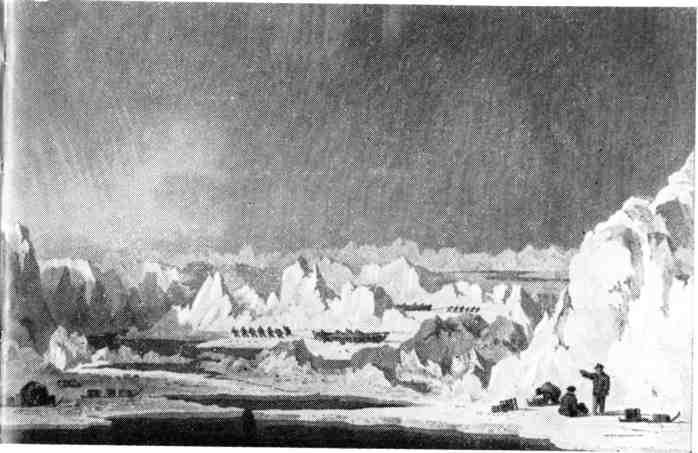 С санями и лодками по дрейфующим льдам. Гравюра из книги У. Парри.