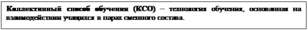 Психологи утверждают: эффективность произвольного запоминания материала в студенческом возрасте может быть оценена такими критериями: читает – 10%, слышит – 20%, видит – 30%, видит и слышим – 50%, обсуждает – 70%, опирается на опыт – 80%, обучает других – 95%. Этим объясняется высокий интерес педагогов к такой образовательной технологии, как взаимообучение в коллективе. Она имеет и другие названия: «организованный диалог», «коллективное взаимообучение», «коллективный способ обучения (КСО)».