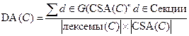 где G (CSA(C)) — объединение склеенных лексем каждого из методов класса. Класс без склеенных лексем не имеет слабой связности по данным. Наиболее точной метрикой связности между секциями данных является клейкость данных (Data Adhesiveness). Клейкость данных определяется как отношение суммы из количеств секций, содержащих каждую склеенную лексему, к произведению количества лексем данных в классе на количество секций данных. Метрика вычисляется по формуле: