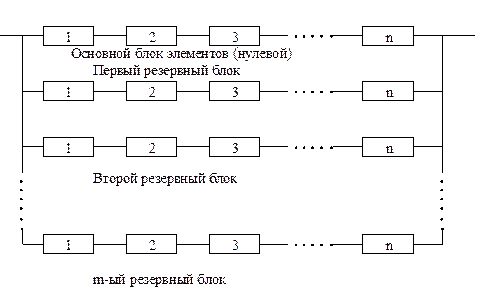 Одноименные элементы в каждом блоке считаются одинаковыми. При отказе основного блока нагрузку воспринимает резервный блок. Основной и резервные блоки полностью нагружены и имеют одинаковую надежность. Вероятность безотказной работы системы определяется выражением: