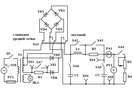 Лабораторная работа выполняется на модернизированном стенде ЭС-1м, с помощью которого можно исследовать два однофазных двухполупериодных выпрямителя: с выводом средней точки вторичной обмотки трансформатора и мостовой выпрямитель. Электрическая схема стенда показана на рис. 9. Включение исследуемого выпрямителя производится переключателем SА1. В положении переключателя «мостовой» к трансформатору Т 1 подключается мостовой выпрямитель, а в другом положении переключателя SА1 подсоединяется выпрямитель «с выводом средней точки» вторичной обмотки трансформатора. Резистор R1 с выключателем SА7 между гнездами XS1 и XS2 предназначены для снятия осциллограммы тока диода VD6.