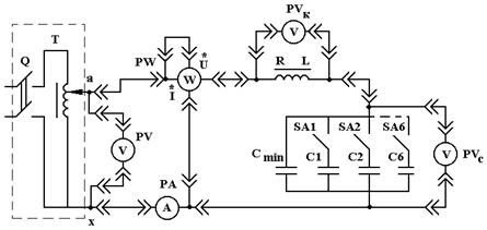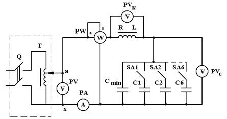 Работа выполняется на универсальном стенде, где установлен лабораторный автотрансформатор (ЛАТР) и необходимые приборы. Индуктивная катушка и батарея конденсаторов с регулируемой (с помощью выключателей) емкостью находятся на столе. Электрическая цепь собирается с помощью комплекта проводов в соответствии со схемой соединений (рис.13.)
