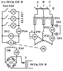 Работа выполняется на универсальном стенде, в котором смонтированы лабораторный автотрансформатор, выпрямитель, ламповая нагрузка, коммутационная аппаратура и необходимые приборы. Электрическая цепь стенда представлена на рис. 22. Трехфазный асинхронный двигатель М расположен за стендом. В качестве нагрузки двигателя используется генератор постоянного тока независимого возбуждения G, соединенный с двигателем муфтой. Генератор нагружается ламповым реостатом EL 1 – EL 7. Регулирование тока возбуждения генератора осуществляется лабораторным автотрансформатором Т, во вторичную цепь которого включен мостовой выпрямитель