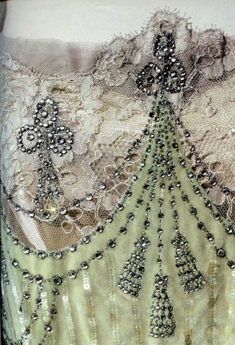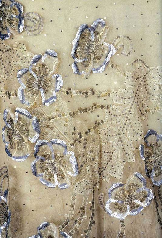 Платье вечернее (лиф и юбка) из белого тюля и шифона на атласном чехле. Принадлежало императрице Александре Федоровне. Лиф очень открытый, с большим овальным декольте и коротким рукавом, притален, со шнипом, с небольшим напуском спереди, на драпированном поясе из серебряной парчи. Декорировано кружевом, «мушками» из бити по тюлю и вышивкой блёстками и фасонными шишками цветочного узора. Москва. Мастерская Н. Ламановой. Начало XX в.