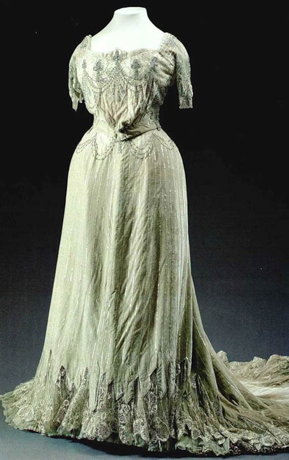 Платье вечернее (лиф и юбка) из бархата цвета морской волны. Принадлежало императрице Александре Федоровне. Лиф притален, со шнипом, на широком поясе углом, спереди с небольшим напуском. Рукава короткие из шифона. Юбка расклешена, с мягкими складками по центру спинки, со шлейфом. Отделано вставками шифона и кружева, с широким кружевным воланом по подолу. По всему платью вышивка бисером, блёстками и стразами. Москва. Мастерская Н. Ламановой. Начало XX в.