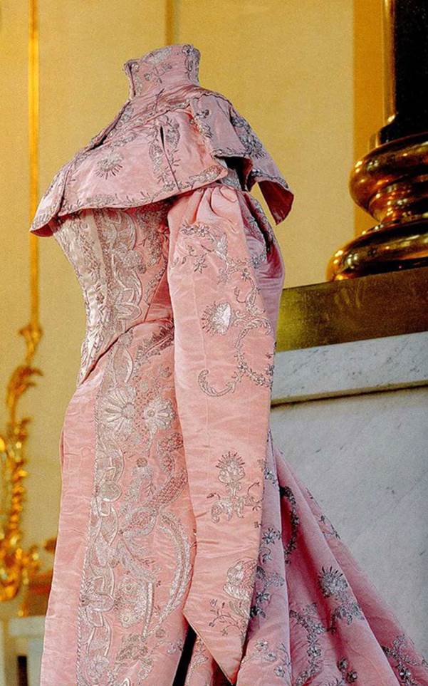 Лиф, шлейф, пелерина, юбка – реконструкция. Лиф очень открытый, с большим овальным декольте, удлинённый, со шнипом, сильно притален, рукава длинные, откидные, с частично открытой проймой. Шлейф съемный, на поясе, с мягкими складками по центру спинки. Короткая круглая пелерина с воротником-стойкой. Платье богато декорировано вышивкой серебряной нитью и канителью растительного орнамента.