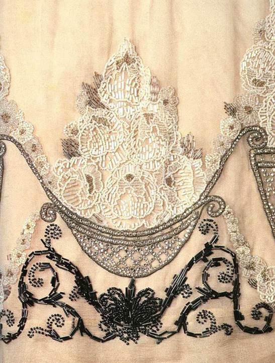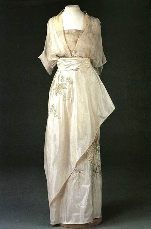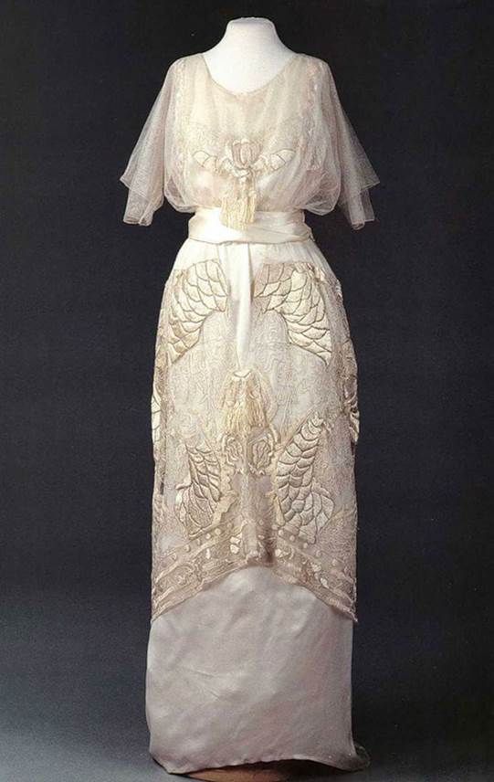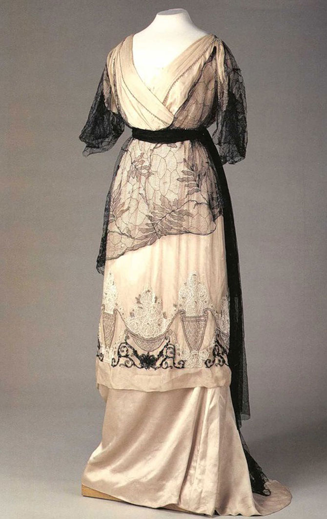 Лиф мягкий, с небольшим напуском, с декольте формы каре, рукава короткие, покроя кимоно. Юбка прямая, узкая, немного собрана по спинке, пришита к лифу, с двумя тюниками. Один – из белого шифона с вышитой белым и чёрным бисером, стеклярусом и стразами широкой каймой из чередующихся ваз разной формы с букетами; второй – из чёрного кружева, сзади переходящий в шлейф. Москва. Мастерская Н. Ламановой. 1912-1913/