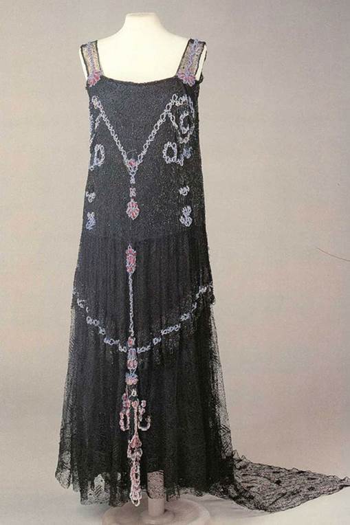 Лиф мягкий, без косточек, свободный вверху, у талии заложен складками, двойной: нижний, из белого кружева и тюля – открытый, на лямках; верхний – из чёрного тюля, с декольте углом и рукавом покроя кимоно за локоть. Юбка из белого кружева, густо собрана по талии, на чёрном шёлковом чехле, с двойным тюником из чёрного тюля с неровной линией подола. Москва. Мастерская Н. Ламановой. 1920-е Т.Т. Коршунова. Русский модельер Надежда Ламанова. Каталог выставки. Издательство Государственного Эрмитажа. Спб., 2002
