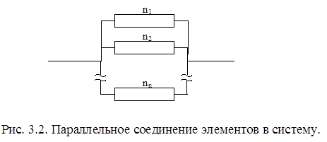 При параллельном соединении n элементов к отказу системы приведет отказ всех элементов (рис. 3.2). Систему с параллельным соединением называют также системой со структурным резервированием элементов (резервированной). Возможны также системы с комбинированием обеих видов соединений.