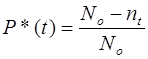 где No - количество однотипных объектов в начале периода испытаний t (например, число однотипных насосов, машин и т.д.); nt - число отказавших за время t, элементов. Индекс P*(t) означает, что это статистическая оценка, а не сам параметр, т.к. для получения значения параметра необходимо, чтобы No®¥. Всегда P(t)£1. Например, если через 1 год после начала работ из 500 единиц оборудования отказало 100, то