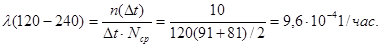 Пример 3.5.2. Во время испытания системы капельного орошения, состоящей из 100 капельниц за первые 120 часов отказали 9 капельниц, за интервал времени 120 –240 часов отказало еще 10 капельниц. Определите частоту и интенсивность отказа капельниц за интервал 120-240 часов. Решение: Частота отказа: