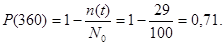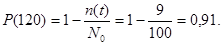 Пример 3.5.3. Во время испытания 100 капельниц за первые 120 часов отказали 9 капельниц, за интервал времени 120 –240 часов отказало еще 10 капельниц, а за интервал 240-360 часов еще 10 капельниц. Определите вероятность безотказной работы за 120, 240 и 360 часов, среднюю частоту и интенсивность отказов капельниц за 360 часов. Решение: Вероятность безотказной работы: