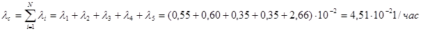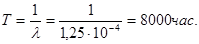 Пример 3.5.4. Грузоподъемное устройство состоит из пяти приборов. Отказ любого из элементов приводит к отказу всей системы. При обследовании установлено, что первый прибор отказал 2 раза в течение 360 часов работы, второй – 3 раза в течении 500 часов, третий и четвертый – 1 раз в течение 280 часов, пятый – 4 раза в течение 150 часов. Определите наработку на отказ, если справедлив экспоненциальный закон распределения. Решение: Интенсивность отказа приборов: