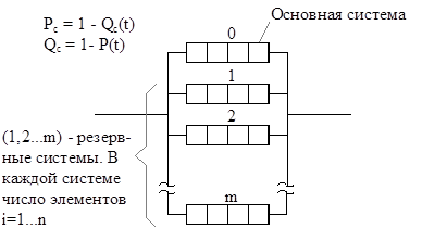 В системах с параллельным соединением элементов, т.е. резервированных системах, определение вероятности безотказного действия производится по более сложным формулам, вид которых зависит от способа резервирования. 1. В системах с общим резервированием при постоянно включенном резерве.