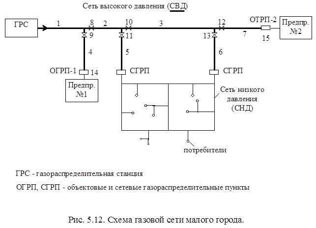 Газопроводы и их оборудование, располагаемое внутри зданий и цехов, являются системами газоснабжения объектов и их к городским распределительным системам не относят. На рис. 5.12. изображена система газоснабжения небольшого города. Газ из ГРС поступает в основную газопроводную сеть высокого (среднего) давления, которая выполнена как тупиковая - разветвленная. Из сетевых ГРП (СГРП) газ поступает в сеть низкого давления, которая раздает газ потребителям. Сеть низкого давления выполнена по кольцевой схеме. Сеть высокого давления тоже может быть кольцевой. По кольцевой схеме выполнена сеть высокого давления среднего города, кроме того она имеет два источника питания: ГРС-1 и ГРС-2 (рис. 5.13). Надежность систем газоснабжения зависит от надежности ее основных элементов: газопроводов, арматуры, ГРС и ГРП.