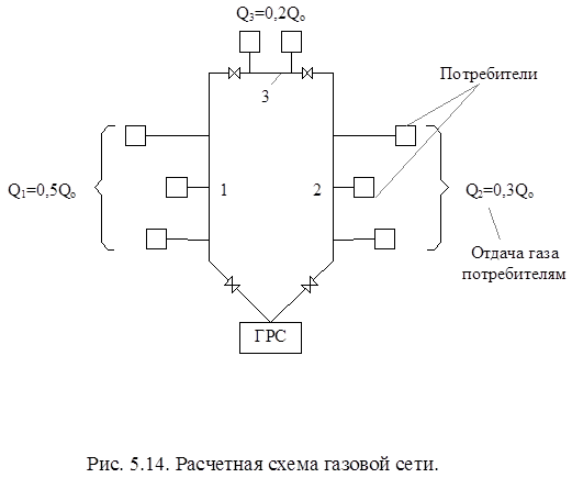 Расчет надежности ведут в два этапа. 1) На первом этапе решают схему сети и определяют необходимый резерв. Необходимость в резервировании схемы и размеры резерва определяют исходя из сравнения полученного значения показателя надежности системы Rсист с нормированной величиной. Все элементы газовой сети, отказы которых приводят к отключению потребителей, следует перенумеровать, определить недоотпуск газа DQj, связанные с отказами и рассчитать показатель надежности системы. При расчете Rсист необходимо знать wi или li всех элементов и расчетное время t. Недоотпуск газа DQj определяют по схеме сети без гидравлических расчетов и потокораспределения, т.к. интенсивность отказов практически не зависит от диаметров газопроводов. Для небольших нерезервированных систем полученная величина Rсист(t) может оказаться достаточной, тогда расчет надежности сети окончен. Большие системы требуют резервирования путем кольцевания и дублирования отдельных элементов. Для снижении недоподачи газа в аварийных случаях 2) Второй этап заключается в расчете резерва в диаметрах труб. Для этого рассчитывают потокораспределение в сети для наиболее неблагоприятных аварийных ситуаций. Расходы газа потребители принимают лимитированные, а перепад давлений максимально допустимый.