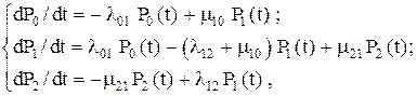 Состояния 0, 1, 2 называют узлами графа, а возможные переходы из одного состояния в другое называют ветвями графа. Академик А.Н. Колмогоров предложил для определения вероятностей нахождения системы в каждом из состояний составлять и решать дифференциальные уравнения, которые и называются уравнениями массового обслуживания. В инженерных расчетах систему этих уравнений можно получать непосредственно по виду графа состояний, применяя следующее правило: для каждого из возможных состояний системы записывается уравнение, в левой части которого Согласно данному правилу, система дифференциальных уравнений для рассматриваемого графа состояний имеет вид