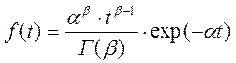 Гамма-распределение времени безотказной работы описывает схему непрерывного, постепенного износа, при котором отказ не наступает вследствие первого же повреждения, а является следствием накопления повреждений. Каждое из этих повреждений происходит по схеме мгновенного повреждения. Граничными условиями применения гамма-распределения являются следующие: · средняя скорость износа устройства постоянна; · средняя скорость износа подвержена случайным вариациям; · начальное качество исследуемых устройств полностью однородно. Случайная величина наработки до отказа T имеет гамма-распределение с параметрами α (масштабный параметр) и β (параметр формы), где