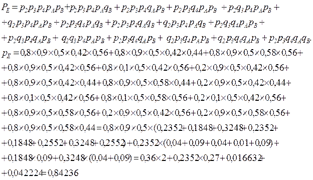 В качестве примера рассматривается комбинированная система, представленная на рисунке 5.12. Здесь элементы 5 и 7, 6 и 8 попарно образуют друг с другом последовательные соединения. Замена элементов 5 и 7, 6 и 8 соответственно элементами А, В позволяет выполнить расчёт надёжности по формулам п. 5.2. Элементы 9, 10, 11 образуют параллельное соединение (п. 5.3.), а элементы 12, 13, 14 – систему “2 из 3” (п. 5.5.1.). При подобной замене соответствующие элементы обозначены С и D. В результате преобразованная схема принимает вид, показанный на рисунке 5.13, а. В ней в свою очередь элементы 2, 3, 4, А, В образуют мостиковую схему (п. 5.5.1), которая заменяется элементом Е. элементы С, D и 15 образуют друг с другом последовательное соединение, обозначенное как элемент F. Схема, полученная после таких преобразований (рис.4.13, б), образует последовательное соединение элементов 1, E, F, для которых справедлива формула последовательного соединения п. 5.2. Пример 5.1. Определить Рсист, если вероятности безотказной работы соответствующих элементов равны: