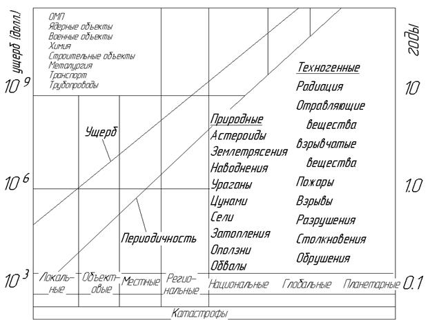 Рис. 15.14 Ущербы и периодичность техногенных аварий