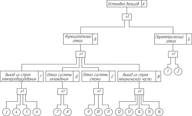 Рис 15..16. «Дерево неисправностей» для вальцов Обозначения: событий А – остановка вальцов; Б – параметрический отказ; В – функциональный отказ; Г – отказ электрооборудования; Д – отказ системы охлаждения; Е – отказ системы смазки; Ж – отказ механической части; 1. низкий уровень охлаждающей жидкости; 2. изменение давления охлаждающей жидкости; 3. отказ электродвигателя; 4. короткое замыкание кабеля на землю; 5. отказ предохранителя; 6. короткое замыкание на корпус; 7. отказ насоса; 8.потеря герметичности системы охлаждения; 9. отказ насоса; 10. отказ питателя; 11. потеря герметичности системы смазки; 12. отказ муфты главного привода; 13. отказ зубчатых колес коробки скоростей; 14.отказ редуктора механизма раздвижения; 15. отказ тормоза; 16. износ ножей. Исходные данные по интенсивности отказов Таблица 15.15