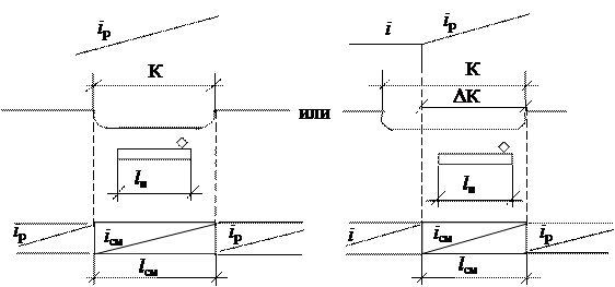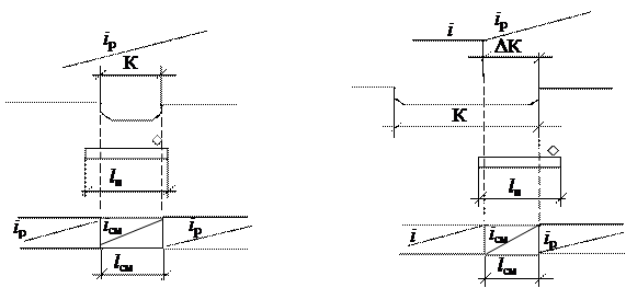 при К при К>lсм, если lcм<lп где К – длина круговой кривой, м; lп – длина поезда, м; lсм – длина участка смягчения руководящего уклона, м; iэ(к) – уклон, эквивалентный дополнительному сопротивлению на кривой, ‰; α – угол поворота кривой, град; ∆α,∆К – части соответственно угла поворота, град, и длины кривой, м, соответствующие участку смягчения руководящего уклона; iр – руководящий уклон, ‰; i – уклон элемента профиля, меньший чем iр,‰; iсм – смягчённый уклон, ‰. Смягчённый уклон определяется по формуле: iсм = iр - iэ(к).