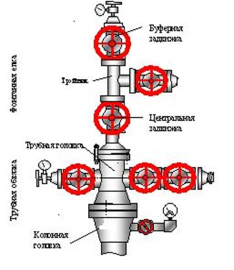 В качестве запорных органов для перекрытия потока используют либо проходные пробковые краны, либо прямоточные задвижки с ручным, пневматическим дистанционным или автоматическим управлением. Манифольды предназначены для обвязки фонтанной арматуры с выкидным шлейфом, подающим продукцию на АГЗУ. Фонтанную арматуру выбирают по необходимому рабочему давлению, схеме, числу рядов труб, климатическому и коррозионному исполнению. В зависимости от условий эксплуатации фонтанные арматуры изготавливаются для коррозионных сред и некоррозионных, а также для холодной климатической зоны. Фонтанные арматуры классифицируют: 1) по рабочему давлению (7;14;16,5;21;70;105 МПа); 2) по схемам исполнения (6 схем); 3) по числу спускаемых в скважину труб (один или два концентрических ряда труб); 4) по конструкции запорных устройств (задвижки или краны) 6) по размерам проходного сечения по стволу (50-100мм) и боковым отводам (50-100мм). В зависимости от типа месторождения в ОАО используется фонтанная арматура тройникового типа из расчета на рабочее давление 14,0 и 21,0 МПа: АФК1-65*14СУ и АФК1-65*21СУ. А -арматура; Ф - фонтанная; К - подвеска подъемной колонны НКТ на резьбе переводника трубной головки; 65 - условный проход ствола и струн, мм; 14,0;21,0 - рабочее давление, МПа; СУ - исполнение для холодной климатической зоны. Встречаются устаревшие типы фонтанных арматур заводов- изготовителей: АФ-3”*21/2”*210(Румыния). К запорным устройствам фонтанной арматуры относятся проходные пробковые краны с ручным управления (КППС-65*14СУ) для арматур с рабочим давлением 14,0 МПа и прямоточными задвижками с ручным управлением с принудительной подачи смазки (ЗМС1-65*21СУ) или автоматической подачей смазки (ЗМАД-65*21). ЗМ- задвижка с уплотнением «металл по металлу»; С или А- уплотнительная смазка принудительная или автоматическая; 1 или Д- одно или двухшиберное уплотнение; 65- условный проход ствола и струн, мм; 21,0- рабочее давление, МПа. Регулирующие устройства предназначены для регулирования режима работы скважины путем дросселирования (установка штуцера)потока рабочей среды изменением площади проходов боковых отводов фонтанной арматуры. Штуцера представляют собой насадку с относительно небольшим проходным сечением от 2 до 20 мм.