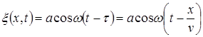 Найдем вид колебания частиц в плоскости, соответствующей произвольному значению х. Для того чтобы пройти путь от плоскости х = 0 до этой плоскости, волне требуется время где v – скорость распространения волны. Следовательно, колебания частиц, лежащих в плоскости х, будут отставать по времени на τ от колебаний частиц в плоскости х = 0, т. е. будут иметь вид