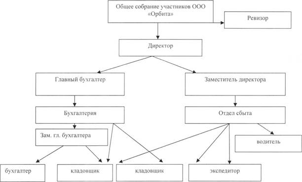 Рисунок 1.1 - Организационная структура управления ООО «Орбита» Директор организует работу и эффективное взаимодействие всех работников, добиваясь высоких показателей технического уровня и качества работ по реализации и оказанию услуг, рационального и экономического расходования всех видов ресурсов, а также принимает меры по обеспечению организации квалифицированными кадрами, для наилучшего использования знаний и опыта работников, решает вопросы, касающиеся обеспечения бесперебойности работы ООО «Орбита».
