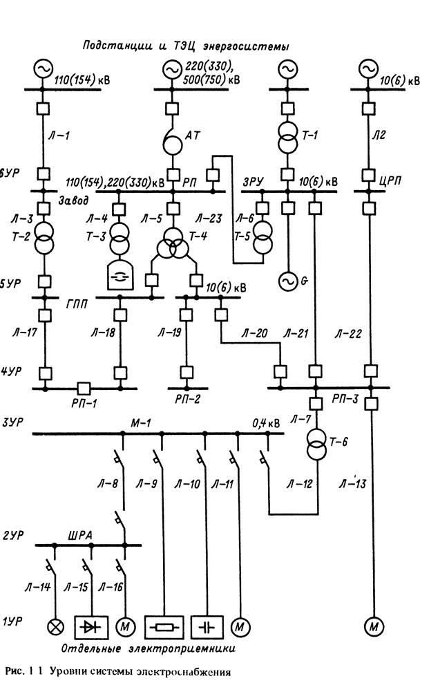 Поясним термины и определения на примере схемы на рис. 1.1, где максимально упрощенно представлена иерархическая схема электроснабжения крупного промышленного предприятия. Предприятие является потребителем электроэнергии (абонентом). С точки зрения энергосистемы предприятие и квартира неразличимы — оба потребители. Стремление свести предприятие к точке, не различать специфических проблем электрики ощущалось и при создании теории больших (сложных) систем электроэнергетики. На схеме показана условная граница раздела предприятие-энергосистема. Через нее предприятие обеспечивается электроэнергией: по линии электропередачи Л-1, как правило, воздушной ЛЭП, от подстанции энергосистемы или РУ 110 кВ ТЭЦ энергосистемы; от автотрансформатора АТ районной подстанции (иногда называемой узловой - УРП), которая имеет, как правило, имя собственное (например, Северная, Металлургическая, Новокузнецкая), возможное напряжение — высшее в энергосистеме и которая удалена на расстояние, обусловленное не электрическими требованиями (сохранение электроснабжения района при крупных авариях на предприятии и др.); от трансформатора Т-1, установленного на подстанции энергосистемы, которая питает одно или несколько предприятий (потребителей), расположена вблизи, а иногда на территории предприятия и играет роль, близкую к роли главной понизительной подстанции (ГПП) предприятия; по линии Л-2 от одной из РУ 10(6) кВ или от ТЭЦ энергосистемы на генераторном напряжении. Число вводов присоединения предприятия к энергосистеме два и больше и составляет несколько десятков при питании на генераторном напряжении аналогично Л-2 и высоком напряжении 110(154), 220(330) кВ аналогично Л-1, AT (далее будем указывать напряжение 110 кВ, подразумевая возможность другого значения напряжения). Возникает задача определения нагрузки предприятия: расчетного значения, например проектного; суммирования показаний счетчиков и фактического суммирования, осуществляемого приборами в режиме реального времени. Присоединение со стороны предприятия к энергосистеме может осуществляться через ОРУ (ЗРУ) 110 кВ, как для Т-2 (может быть глухой ввод кабельной линией 110 кВ); через РП 110 кВ предприятия, от которого питаются специальные подстанции, например печная Т-3, и обычные ГПП, например с трансформаторами с расщепленной обмоткой Т-4 через ГРУ 10(6) кВ собственной ТЭЦ, где установлены трансформаторы связи Г-5; через РП 16(6) кВ предприятий, которые иногда называют центральными - ЦРП (их может быть несколько). Заводские подстанции 110/10 кВ (возможность трансформации на 6 кВ здесь и далее подразумевается) носят разные наименования: главные понизительные (преобразовательные) - ГПП, подстанции глубокого ввода - ПГВ, опорные подстанции - ОП. Возможны и оригинальные