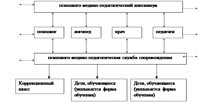 1. Специфика организации учебно-воспитательной и коррекционной работы с детьми, имеющими нарушения развития, обусловливает необходимость специальной подготовки педагогического коллектива образовательного учреждения общего типа, обеспечивающего интегрированное образование. Педагогические работники образовательного учреждения должны знать основы коррекционной педагогики и специальной психологии, иметь четкое представление об особенностях психофизического развития детей с ограниченными возможностями здоровья, методиках и технологиях организации образовательного и реабилитационного процесса для таких детей. В связи с этим в школе выстраивается планомерная работа по повышению квалификации специалистов по проблемам организации учебно-воспитательной и коррекционной работы с детьми, имеющими нарушения развития (приводятся данные о повышении квалификации специалистов образовательного учреждения в данном направлении, планирование этой работы). 2. Сведения об обеспечении учебно-методической литературой, используемой для обучения детей с ограниченными возможностями здоровья, в том числе специальных учебников, учебных пособий и дидактических материалов (указываются учебные пособия, используемые при коррекционной работе). 3. Создание необходимых условий для обеспечения доступности качественного образования для детей с ограниченными возможностями здоровья (указываются конкретные условия, существующие в общеобразовательном учреждении): - оборудование помещений (например, логопедический кабинет) и их оснащение; - технические средства обучения коллективного и индивидуального пользования, услуги ассистента (помощника), оказывающего детям необходимую техническую помощь при (?) проведении групповых и индивидуальных коррекционных занятий; - специальные приспособления для обучения детей-инвалидов (см. приложение 2). 5. Механизм взаимодействия в разработке и реализации коррекционных мероприятий учителей, специалистов в области коррекционной педагогики, медицинских работников образовательного учреждения и других организаций, специализирующихся в области семьи и других институтов общества, который должен обеспечиваться в единстве урочной, внеурочной и внешкольной деятельности. Внутренний механизм взаимодействия:
