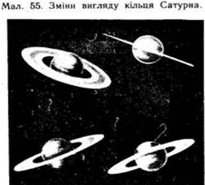 Російський учений А. А. Бєлопольський (1854—1934), вивчивши спектр кільця, підтвердив теоретичний висновок про те, що кільце в Сатурна має бути не суцільним, а складатися з безлічі дрібних частинок.. За спектром, використовуючи ефект Доплера, він установив, що внутрішні кільця обертаються швидше від зовнішніх за III законом Кеплера. Фотографії, передані автоматичними станціями, запущеними до Сатурна, показали, що його кільце складається з багатьох сотень окремих вузьких малих «кілець», розділених темними проміжками. Припускають, що така структура кілець пов'язана з гравітаційним впливом численних супутників планети на рух частинок речовини, яка утворює кільця. Система кілець Сатурна або виникла внаслідок руйнування супутника планети, що колись існував (наприклад, при його зіткненні з іншими супутником чи астероїдом), або є залишком тієї речовини, з якої в далекому минулому утворилися супутники Сатурна і яка через припливну дію планети не змогла «зібратися» в окремі супутники. Кільця Сатурна являють собою пласку систему з безлічі дрібних супутників планети. У Сатурна відомо 17 супутників. Найбільший супутник - Титан, він також один із найбільших за розмірами й масою супутників у Сонячній системі. Супутник Янус - найближчий до Сатурна, розташований майже впритул до планети. Один із супутників «Феба» - рухається по орбіті з досить великим ексцентриситетом у зворотному напрямку. Уран - за розташуванням сьома від Сонця планета, за діаметром (із радіусом 25 650 км) майже вчетверо більша за Землю. Дуже віддалена планета від Сонця й освітлена порівняно слабко. Середня густина Урана (1,58 г/см3) трохи більша, ніж густина Сатурна та Юпітера, хоча речовина в надрах цих гігантів стиснута набагато сильніше, ніж на Урані. У складі атмосфери Урана за спектроскопічними спостереженнями знайдені водень і невелика кількість метану, за непрямими ознаками, відносно велика кількість гелію. Як й інші планети-гіганти, Уран має такий склад, імовірно, майже до самого центру. Уран дотепер погано вивчений, тому що розглянути його вкрай складно через малі кутові розміри в полі зору телескопа. З цієї ж причини неможливо вивчити і закономірності обертання планети. Очевидно, Уран (на відміну від інших планет) обертається навколо своєї осі, ніби лежачи на боці. Такий нахил екватора створює незвичайні умови освітлення: на полюсах у певний сезон сонячні промені падають майже прямовисно, а полярні день і ніч охоплюють (поперемінно) усю поверхню планети, крім вузької смуги уздовж екватора. Через те що Уран обертається по орбіті навколо Сонця за 84 роки, то й полярний день на його полюсах триває 42 роки, потім змінюється полярною ніччю такої ж тривалості. Лише в екваторіальному поясі Урана Сонце регулярно сходить і заходить із періодичністю, рівномірною до осьового обертання планети. Навіть у тих ділянках, де Сонце розташоване в зеніті, температура на видимій поверхні хмар складає біля -215°С. За таких температурних умов деякі гази замерзають. Залізокам'яне ядро Урана за розміром (близько 8000 км) більше порівняно з планетами земної групи. Генероване магнітне поле Урана також подібне до земного. Незвичайною особливістю Урана є система кілець, віддаленість яких від планети складає від 1,6 до 1,85 радіуса Урана. Вузькі кільця, що виглядають як "ниткові" утворення, складаються з безлі