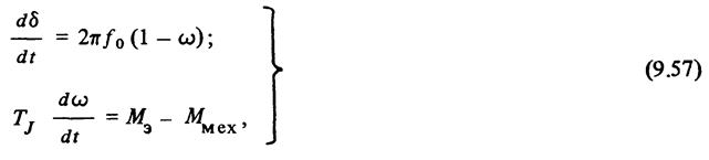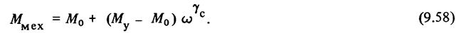 Система уравнений (9.53)-(9.58) характеризует узел промышленной нагрузки с СД в переходных процессах и в установившемся режиме. Расчетам процессов пуска или группового самозапуска СД предшествует расчет установившегося режима узла нагрузки. Исходными данными для расчета установившегося режима помимо параметров схемы замещения узла нагрузки и параметров схемы замещения СД, определенных по каталожным данным, являются: коэффициенты загрузки СД по моменту на валу двигателя Кз = Му, прочая нагрузка рн.пр, Он.пр, напряжение на шинах РУ узла нагрузки Uу = U 0ном. В установившемся режиме СД уравнение (9.86) принимает вид Мэ =Ммех. В установившемся режиме, предшествующем пуску или групповому самозапуску СД, определяются параметры режима СД и узла нагрузки в целом и ЭДС ес электрической системы. Расчеты переходных