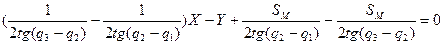 Прямая М2 Р соединяющая позицию маневрирующего корабля в момент измерения второго пеленга М2 (координаты (x = SM; y = 0)) с полюсом маневрирования представляет собой общую хорду окружностей О1 и О2 и, следовательно, перпендикулярна линии соединяющей центры этих окружностей. Уравнение перпендикуляра проходящего через точку с координатами (SM; 0) будем искать в виде: