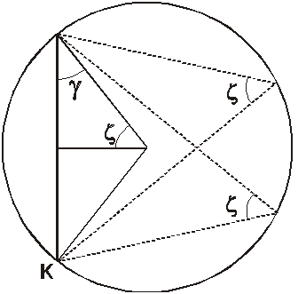 aм =z ґм = 0 и место полюса совпадает с позицией маневрирующего корабля. При значениях m Î(0, ¥) полюс маневрирования располагается на границе кругового сегмента с дугой 360°-2z. Хордой является линия пеленга (рис11). Действительно по теореме 4: ПМ - ПК = DП = z. При неизменных курсах кораблей z= const и опирается на отрезок МК = D. Из треугольника МОL: Ð MLO = 90° т.к. центр окружности всегда лежит на перпендикуляре к хорде Ð MOL = z как половина центрального угла тогда: