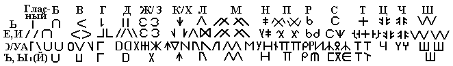 Итак, исходя из приведённых датировок свастических изображений, выполненных на керамических сосудах евроазиатского континента, мы можем заключить: насечки, выполненные на керамике, найденной в Китае в период с 4.770 года до н.э. по 2.690 год до н.э., могут принадлежать более древней цивилизации – Славяно-русской и, предположительно, выполнены в традиционной Свастической технике письма, датируемого гораздо более древними датами, чем 7.000 лет до н.э. Выше приведенные изображения насечек мы сопоставим последовательно с русской слоговой письменностью, а потом и со всем спектром свастических символов. Изображения насечек (рис. 1) со стоянок Баньпо, Цзянчжай, Линкоу, Яньтоу, Улоу, Синье, Лицзягоу, датируемые 4.770 г. до н.э., мы сравним с силлабарием слоговой письменности, опубликованным В.А. Чудиновым в статье «Руница и алфавитное письмо [21] (рис. 10).