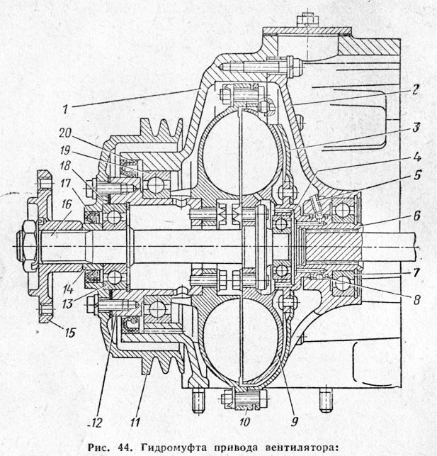 Передня кришка 1 і корпус 2 з'єднані гвинтами і утворюють порожнину, в якій встановлена гідромуфта. Ведучий вал 6 в зборі з кожухом 3, провідне колесо 10, вал 12 з'єднані між собою болтами і становлять провідну частину гідромуфти, яка передає крутний момент від колінчастого вала через шлицевой валик на шків 11 привода генератора. Провідна частину гідромуфти обертається в шарикопідшипниках 7 і 19. Ведене колесо 9 у зборі з валом, на якому кріпиться маточина 15 вентилятора, складають ведену частину гідромуфти, передавальної крутний момент на вентилятор. Ведена частина гідромуфти обертається у двох шарикопідшипниках 4 і 13. Ущільнення гідромуфти здійснюється гумовими манжетами 17 і 20. Вентилятор може працювати в одному з трьох режимів: