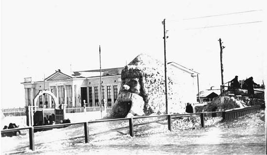 31. Огромная голова витязя (из сказки А.С.Пушкина), изготовленная изо льда на Новый Год около магаданского театра.