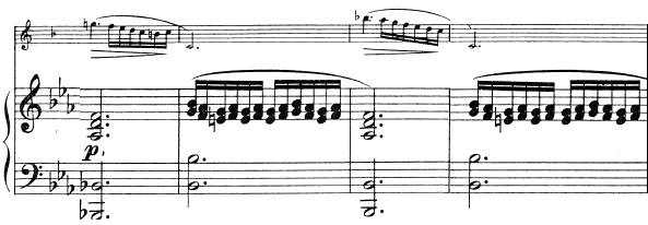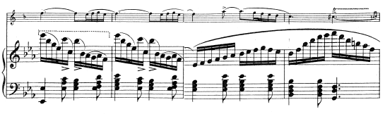 Трио (C)–51 такт, смена характера, фактуры, аккомпанемент в партии фортепиано меняется на постоянное tremolo, динамика forte, тональность – Des-dur, характер - свободный, вызывающий. Далее идёт связка - 10 тактов, основанная на главной теме рефрена, но варьированная, на 2 октавы ниже, она подводит нас к рефрену.