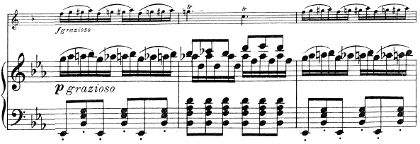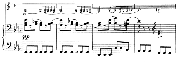 3-е предложение – дополнение, 6 тактов, варьированоповторяется тема из 2-го предложения в партии фортепиано, динамикаforte показывает яркий, блестящий характер и завершает рефрен.