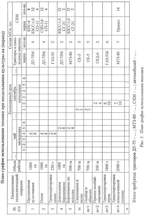 Практическое занятие 6. СОСТАВЛЕНИЕ ПЛАНА-ГРАФИКА На основании сведений о сроках проведения операций, составах агрегатов и их численности ведется планирование работы МТП. План-график работы МТП строят по форме (рис. 1) на листе чертежной или миллиметровой бумаги формата A3. В соответствующие графы плана-графика («Технологические операции», «Объем работ», «Состав МТА») вписывают название операции, физический объем работы и виды средств механизации, которыми эта работа выполняется. В графах «Календарный срок» и «Состав МТА» отмечают начало и окончание работ и записывают количество агрегатов, которое требуется для этой операции. Календарные даты (начало-конец) соединяют между собой хорошо видимой чертой, над которой указывают число агрегатов, а под ней – количество рабочих дней периода. Все календарные периоды для удобства планирования разбивают на пятидневки. В графу «Состав МТА» записывают потребное число отдельных видов технологических средств по каждой операции. На основании плана-графика находят наиболее напряженные периоды работ по потребностям в технике и определяют число машин разных видов в периоде. Численный состав МТП подбирают на основании наибольших потребностей в тех или иных машинах по периодам.