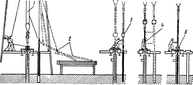 Рис 1.8 Схема наращивания бурильного инструмента. 1 — спуск бурильной трубы в шурф для двухтрубки, 2 — подъем соединения с мостков (стеллажа) для труб, 3 — свинчивание вертлюга и ведущей трубы с бурильной трубой, 4 — посадка в муфту бурильной трубы; 5 — наращенная бурильная колонна го това к бурению