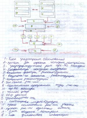 Проектная документация состоит из исходных материалов и материалов проекта реконструкции. В исходную документацию входят техническое заключение и строительный паспорт. Техническое заключение комплектуют из трех частей: архитектурной, конструктивной и экономической. В архитектурную часть включают: ситуационный план, план участка с благоустройством М1:500, план всех этажей здания инвентаризационные или обмерные М1:200, габаритные разрезы, архитектурное планировочное задание и задание на проектирование. Первый из этих документов формируют градостроительные требования к предстоящей реконструкции. Задание на проектирование выдает эксплуатационная организация. Конструктивная часть технического заключения является обычно небольшой по объему. В ней помещают подробные сведения о видах и состоянии всех конструктивных элементов здания, дают планы перекрытий и описывают их по отдельным участкам и этажам.