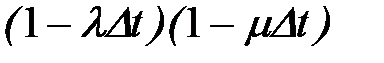 где Эти уравнения следуют из того, что вероятность нахождения в системе n заявок в момент времени (t+Dt) равна вероятности нахождения в системе n заявок в момент t, умноженной на вероятность того, что за время Dt в систему не поступит ни одной заявки и ни одна заявка не будет обслужена, плюс вероятность нахождения в системе (n-1) заявок в момент времени t, умноженная на вероятность того, что за время Dt поступит одна заявка и ни одна заявка обслужена не будет, плюс вероятность нахождения в системе (n+1) заявок в момент t, умноженная на вероятность того, что за время Dt одна заявак покинет систему и не поступит ни одной заявки. Вероятность того, что за время Dt не поступит ни одной заявки и ни одна заявка не покинет систему, равна