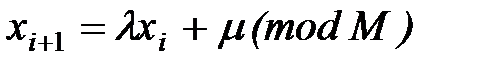 Для получения случайных чисел на ЭВМ используются алгоритмы, поэтому такие последовтельности, являющиеся по сути детерминированными, называются псевдослучайными. ЭВМ оперирует n-разрядными числами, поэтому поэтому на ЭВМ вместо непрерывной совокупности равномерных случайных чисел интервала (0,1) используют дискретную последовательность 2n случайных чисел того же интервала - закон распределения такой дискретной последовательности называется квазиравномерны распределением. Требования к идеальному генератору случайных чисел: 1. Последовательность должна состоять из квазиравномернло распределенных чисел. 2. Числа должны быть независимыми. 3. Последовательности случайных чисел должны быть воспроизводимыми. 4. Последовательности должны иметь неповторяющиеся числа. 5. Последовательности должны получаться с минимальными затратами вычислительных ресурсов. Наибольшее применение в практике моделирования на ЭВМ для генерации последовательностей псевдослучайных числе находят алгоритмы вида: xi+1=Ф(xi), представляющие собой реккурентные соотношения первого порядка. Пример. x0 = 0,2152, (x0)2=0,04631104, x1 = 0,6311, (x1)2=0,39828721, x2=0,8287 и т.д. Недостаток подобных методов - наличие коррелляции между числами последовательности, а иногда случайность вообще отсутствует, например: x0 = 0,4500, (x0)2=0,20250000, x1 = 0,2500, (x1)2=0,06250000, x2=0,2500 и т.д. Широкое применение получили конгруэнтные процедуры генерации псевдослучайных последовательностей. Два целых числа a и b конгруэнтны (сравнимы) по модулю m, где m - целое число, тогда и только тогда, когда существует такое целое число k, что a-b=km. 1984º4 (mod 10), 5008º8 (mod 103). Большинство конгруэнтных процедур генерации случайных чисел основаны на следующей формуле: