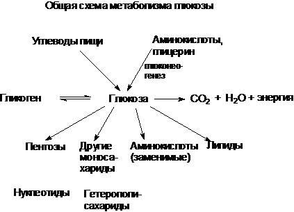 Наиболее распространенный углевод млекопитающих – глюкоза. Она играет роль связующего звена между энергетическими и пластическими функциями углеводов, поскольку из глюкозы могут образоваться все другие моносахариды, и наоборот – разные моносахариды могут превращаться в глюкозу. Источником углеводов организма служат углеводы пищи – главным образом крахмал (хлеб и хлебобулочные изделия, макароны и макаронные изделия, картофель, крупы и т.д.), а также сахароза (сахар, варенья и т.д.) и лактоза (в составе молока). Кроме того, глюкоза может образовываться в организме из аминокислот, а также глицерина, входящего в состав жиров.