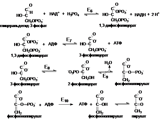 Е6 - глицеральдегид-3-фосфатдегидрогеназа Е7 - фосфоглицераткиназа Е8 - фосфоглицератфосфомутаза Е9 - енолгидратаза Е10 - пируваткиназа Таким образом, суммарное уравнение 2 этапа гликолиза выглядит следующим образом: Глицеральдегид-3-фосфат + НАД+ + 2 АДФ + 2 Н3РО4 → пируват + НАДН·Н+ + 2 АТФ