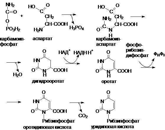 Предшественником цитидиловых и тимидиловых нуклеотидов служит уридиловая кислота (УМФ), которая образуется из углекислого газа, амидной группы глутамина и аспарагиновой кислоты. Синтез УМФ de novo, включающий 6 последовательных стадий, протекает главным образом в цитозоле клеток при участии 3 ферментов, 2 из которых являются полифункциональными. Первый полифункциональный фермент содержит домены, имеющие активность карбамоилфосфатсинтетазы II, аспартаткарбамоилтрансферазы и дигидрооротазы, и катализирует первые 3 реакции этого метаболического пути. Митохондриальная НАД-зависимая дигидрооротатдегидрогеназа окисляет дигидрооротат в оротат. Второй полифункциональный фермент катализирует превращение оротата в нуклеотид и его последующее декарбоксилирование до УМФ, т.е. проявляет оротатфосфорибозилтрансферазную и оротидилатдекарбоксилазную активности. Первая реакция синтеза УМФ – это образование карбамоилфосфата: СО2 + глутамин + 2 АТФ + Н2О ® карбамоилфосфат + глутамат + 2 АДФ + Фн Реакция катализируется карбамоилфосфатсинтетазой II, локализованной в цитозоле всех клеток организма (в противоположность карбамоилфосфатсинтетазе I, локализованной в митохондриях печени). Далее карбамоилфосфат в реакции с аспарагиновой кислотой образует карбамоиласпарагиновую кислоту, которая превращается в дигидрооротовую кислоту.