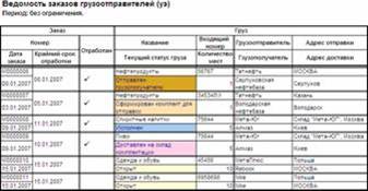 Использование готовых шаблонов позволяет упростить оформление заказов и избежать случайных ошибок. В программе предусмотрено автоматическое изменение и контроль статуса состояния заказов и грузов. Статус изменяется при оформлении соответствующих документов, например: · Оформление документа «Заказа грузоотправителя» устанавливает статус в состояние «Открыт»; · Оформление документа «Поступление на склад» устанавливает статус в состояние «Доставлен на склад комплектации»; · Оформление документа «Рейс» устанавливает статус в состояние «Отправлен грузополучателю» и т.д.; В журналах документов предусмотрена возможность произвольной настройки цветовой гаммы для удобного визуального контроля статусов: