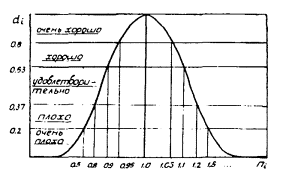 где nk - коэффициент неадекватности по параметру yk. Затем принимаем граничные оценки для коэффициентов неадекватности: 0,95 ≤ пk ≤ 1,05 - очень хорошо; 0,9 ≤ пk ≤ 0,95; 1,05 < пk ≤ 1,1 - хорошо; 0,8 ≤ пk ≤ 0,9; 1,1 < пk ≤ 1,2 - удовлетворительно; 0,5 ≤ пk ≤ 0,8; 1,2 < пk ≤ 1,5 - плохо; пk ≤ 0,5; пk > 1,5 - очень плохо. Примечание Совершенно очевидно, что могут быть и другие граничные оценки. Для уменьшения влияния субъективного фактора следует воспользоваться мнением нескольких специалистов. При обобщении этих мнений и установлении степени согласованности между различными специалистами можно воспользоваться методом ранговой корреляции [23]. После назначения границ коэффициентов неадекватности определяем частный показатель желательности dj для каждого вида параметров yj расчетной модели, для чего воспользуемся графиком кривой желательности (рис. 2), на котором по оси ординат нанесены частные показатели желательности dj, а по оси абсцисс - соответствующие границы коэффициента неадекватности [ nk ] После определения частных показателей функции желательности dj для каждого вида расчетных параметров вычисляем обобщенный показатель желательности по всем параметрам напряженно-деформированного состояния D, который рассматриваем как формализованную оценку пригодности расчетной модели.